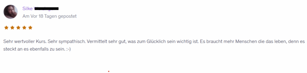 Lass Dein Leben doch einfach leichter werden. Ich zeige Dir in diesem Kurs wie das geht und auch, was uns oft vom Glücklichsein abhält. In den allermeisten Fällen stehen wir uns nur selbst im Weg. Ich habe das auch lernen müssen und nun kann ich gar nicht mehr anders, als glücklich zu sein.